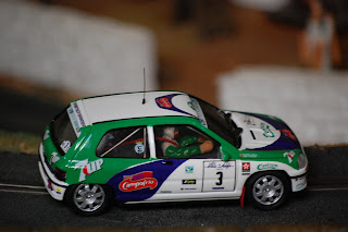 Para el modelo a escala partimos de un scx al que habro las tomas de aire, bajo en altura para hacer versión de asfalto, modifico el alerón y pinto de blanco, las calcas son de Xesqu(calcasderallye),el azul se ve un pelín más claro pero es por el flash de la fotografía, barniz de automoción y llantas de 6 radios de ninco.